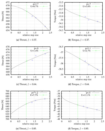 Figure 2 shows the results of the discretisation uncertainty quantification for the thrust and torque values computed for the three advance coefficients. The figures show that the order of accuracy p is in the range 0.5 to 1.7. means that a fit was made using first and second order exponents. The order of accuracy is smaller than the typical value of two that would have been obtained when a quadratic upwind differencing (QUICK) scheme was used for the convective flux discretisation. However, with a QUICK scheme, the computations did not converge.