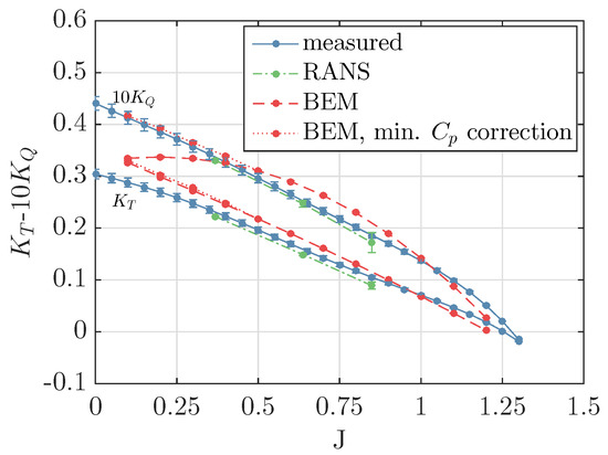 From the comparison between the measured open water diagram and the open water curves calculated with BEM and RANS, it can be concluded that, for the two lowest advance ratios considered in this work, the resemblance between RANS predicted and measured and values is acceptable. The differences that were found for the highest advance ratio might originate from the turbulence modelling. A transition model might be more appropriate, especially for the highest advance coefficient, but was considered out of the current scope. It can be concluded that the open water curves calculated with PROCAL clearly show the limitations of BEM. For high advance coefficients (), the viscous effects play an increasing role and therefore the PROCAL results become inaccurate. For , a strong leading edge vortex is generated in the RANS results, and it is hypothesized that this is the reason that the results of the PROCAL calculations diverge from measured results for low advance ratios.