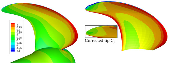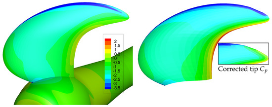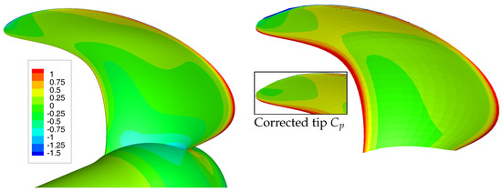 Pressure coefficient, , on the pressure side for , RANS (left) BEM (right). The insert figure shows the BEM pressure distribution after the tip pressure correction.