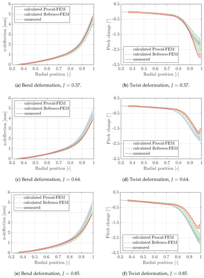 From the comparison of RANS-FEM and BEM-FEM results to the results of the blade deformation measurements on the epoxy propeller, it can be concluded that the bending response is well predicted with the RANS-FEM and BEM-FEM simulations. For the BEM-FEM coupling, this is despite the limitations of BEM and the complicated flow characteristics, and, therefore, it is expected that, for many other propeller geometries, the BEM-FEM coupling can correctly predict the bending response. Depending on the advance ratio, a fair to poor prediction of the twist deformations of the epoxy propeller is obtained with the RANS-FEM and BEM-FEM coupling. The best agreement between measured and calculated twist deformations is obtained for the RANS-FEM results for an advance ratio of 0.64, in which leading edge vortex separation is present but limited compared to the lowest advance ratio and viscous forces might be less dominating than for the highest advance coefficient.