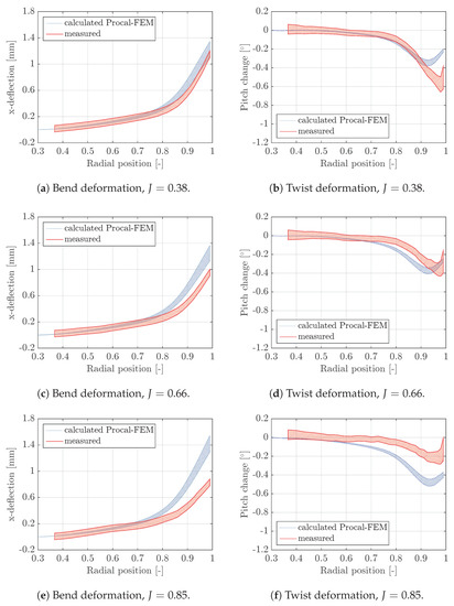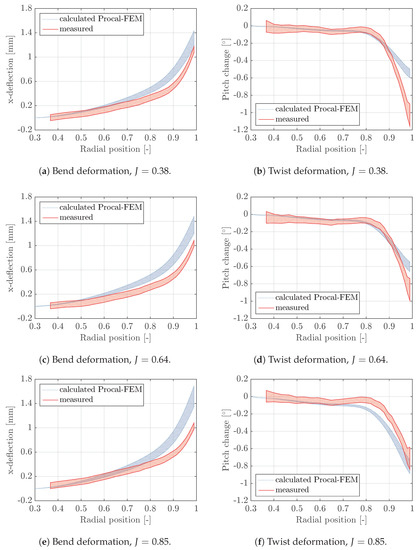 The discretisation uncertainties in the BEM-FEM calculations are smaller than 0.5% and assumed negligible compared to the modelling errors as described above. The RANS grid discretisation uncertainties in bend and twist deformations have been estimated with the same method and grids as used for the thrust and torque uncertainty estimation in Section 4.2.1. This means that, in total, twelve RANS-FEM calculations have been performed—for every flow condition, four calculations with the four RANS grids. Then, for each radial station, the uncertainties in mid-chord bend deformation and twist deformation were calculated from the solutions of the four systematically refined grids.