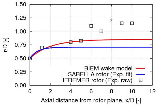 where constants are derived from experimental data describing the wake evolution of hydrokinetic turbines over a range of operating conditions. In the present study, two datasets are considered: Micek et al. [19] with wake flow measurements up to 10 diameters downstream of a three-bladed turbine with 3% onset flow turbulence, and Del Frate et al. [20] fitting measurements in the axial range and the limit at infinite distance downstream of the rotor from Betz theory, . Results extracted from the two datasets and the analytical expansion law from Equation (9) with are illustrated in Figure 2. It should be noted that at large axial distance from the rotor, the proposed law determines an expansion rate that is intermediate between idealised conditions from the Betz theory and real conditions affected by non negligible background turbulence.