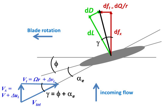 Once quantities are known, blade loads correction is obtained through the following procedure. From the BIEM solution, sectional contributions to axial force and tangential force are determined from Equation (3). Next, wake-induced velocity along blade span is determined by taking the gradient of Equation (2) (with ), and the radial distribution of the effective angle of attack is evaluated. Radial distributions of sectional drag and lift follow by projecting force in direction normal and tangent to the effective inflow, as sketched in Figure 3, where is the angular pitch of the blade section at radius r.