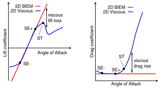 where and are, respectively, drag and lift per unit length determined under inviscid 2D flow conditions (i.e., by a 2D BIEM) at angle of attack , while and are profile drag and lift under 2D viscous flow conditions.