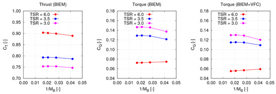 Blade and hub surface discretization parameters are determined as the result of a grid sensitivity study. Each blade is discretized into elements chordwise from leading edge to trailing edge and elements spanwise. Four blade grid levels with and are considered. Hub and wake surface discretizations are built according to blade grid refinement level. Figure 6 presents inviscid-flow thrust and torque predicted by BIEM using the four grids. Three representative TSR values are considered. The torque coefficient evaluated by including the viscous flow correction is also presented to highlight that the VFC model has no effect on the sensitivity of results to grid refinement. From these results it is concluded that a discretization with , is adequate to minimise the effect of further grid refinement on results. In this case, the hub surface is divided into 42 and 54 elements, respectively, in circumferential and longitudinal directions, and the wake is discretized into 36 elements along radius and 60 elements streamwise per revolution. The wake portion considered in the numerical solution of Equation (2) extends for 10 revolutions.