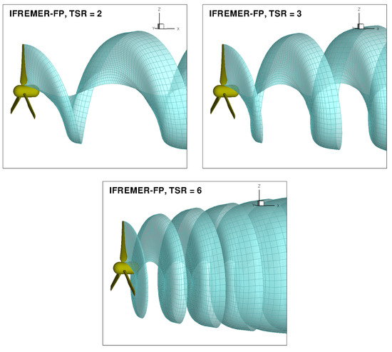 IFREMER-FP turbine. Trailing wake geometry of BIEM model at different operating conditions: TSR = 2 (top left), TSR = 3 (top right), TSR = 6 (bottom).