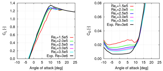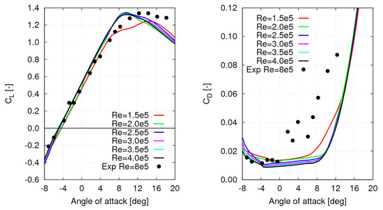 Lift and drag curves calculated by X-Foil are presented in Figure 10. In particular, results for 5 values of Reynolds number are considered in order to adequately describe lift and drag properties over the range of interest (Figure 9 Left). Lift and drag curves from experimental data at 3E6 in [23] are also given for comparison.