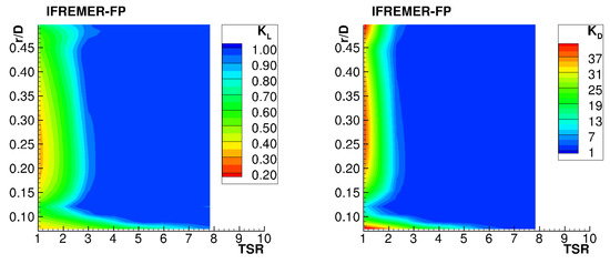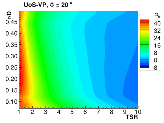 Viscous flow effects on blade loads are determined by applying the VFC model described in Section 2.2. The evaluation of correction factors in Equation (11) requires that blade section lift and drag properties are known. For this purpose, the inviscid-flow BIEM solution is used to estimate the local Reynolds number from Equation (6), and the effective angle of attack in Figure 3, at all blade sections for the TSR range from zero to 8 considered in model tests. Results in left Figure 9 show that the local Reynolds number varies between and over most of the TSR range of interest. Right Figure 9 depicts a positive effective angle of attack that increases from values close to zero for the highest TSR to 20–25 degrees for TSR between 1 and 2. At given TSR , both Reynolds and angle of attack present limited variations over a wide blade portion between 30% and 90% of span.
