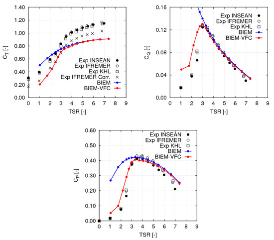 IFREMER-FP turbine performance predictions by BIEM and BIEM-VFC compared to experimental data in [11]: thrust (top left); torque (top right) and power (bottom) coefficients.