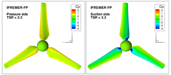 The IFREMER-FP turbine performance is analysed with reference to experimental conditions corresponding to the highest inflow speed, m/s. This choice is motivated to avoid a too small Reynolds number characterizing the blade flow. The tip speed ratio is varied between zero and 8. Comparing with the physical model in [11], it may be noted that the stanchion supporting the turbine is not considered in numerical simulations. Similarly, the nacelle portion downstream of the turbine hub is not present in the computational model, see Figure 5.