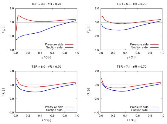 Consistent with sectional angle of attack values commented above, pitch settings limit flow separation and stall effects to very low values of TSR , while in case , most of the addressed operating range is under the effect of flow separation and stall.