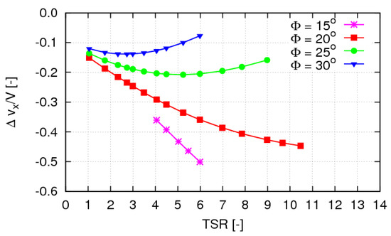 The trailing wake model described in Section 2.1 is used to determine the turbine wake surface. Figure 7 maps the intensity of wake-induced axial velocity evaluated by BIEM at axial locations corresponding to rotor blade trailing edge and at different radial positions over a range of operating conditions identified by the parameter TSR.