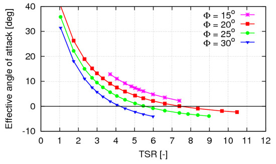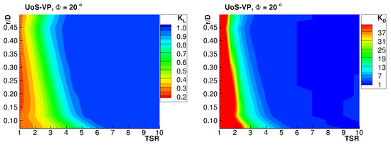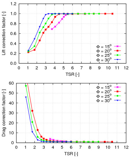 Figure 11 maps correction factors along blade span and over the TSR range of interest. Values close to one denote conditions where blade flow is attached or weakly separated and no correction of sectional loads by BIEM is needed. This occurs at TSR ≃ 2.5 and higher, which corresponds to effective angle of attack below 10–12 degrees, as shown in Figure 9. At lower TSR , the effective angle of attack increases up to stall, as apparent from polar curves in Figure 10. As expected, the lift factor drops below 1, while the drag factor rapidly grows, to simulate, respectively, stall-induced lift loss and drag rise.