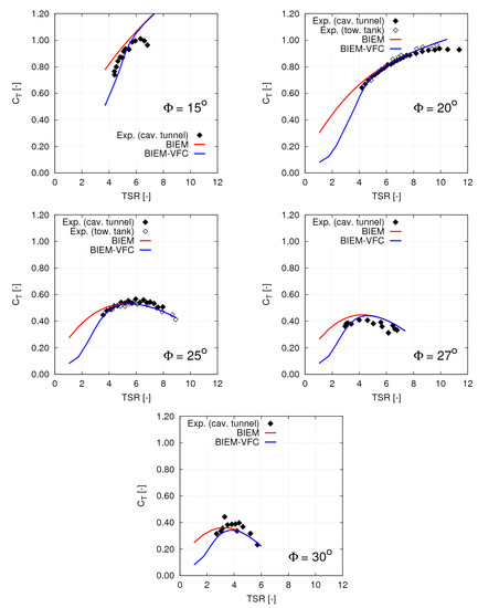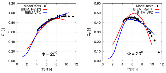 Comparisons between the present BIEM-VFC model and the BIEM with viscous flow correction proposed in [7] are presented in Figure 30. In general, the agreement of the two numerical models with experimental data is comparable with some exceptions. Results by the present BIEM-VFC model better reproduce measured turbine power in case and thrust in case , while results from [7] better predict thrust in case . In these cases, differences occur throughout the TSR range and hence they can be explained as a combined effect of different viscosity correction and trailing wake models in the two formulations.