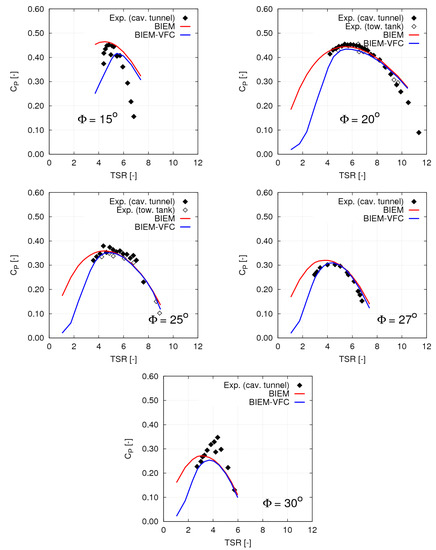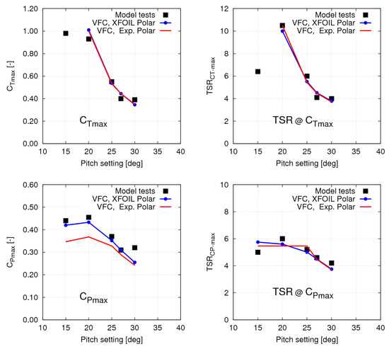 The capability of the BIEM-VFC model to correctly describe turbine performance trends at different pitch settings can be discussed considering results in Figure 27, where four performance indicators are considered: maximum value of thrust coefficient , maximum value of power coefficient , and corresponding values of TSR where maxima are established (labelled, respectively, as TSR@, and TSR@). Numerical predictions by BIEM-VFC and polar data from X-Foil (label: VFC, XFOIL Polar) are compared with polynomial fits of experimental data from cavitation tunnel tests as presented in Figure 7 of [13] (label: Model tests). Numerical results by BIEM-VFC using experimental data for blade section lift and drag taken from measurements in [24] are also presented (label: VFC, Exp. Polar).