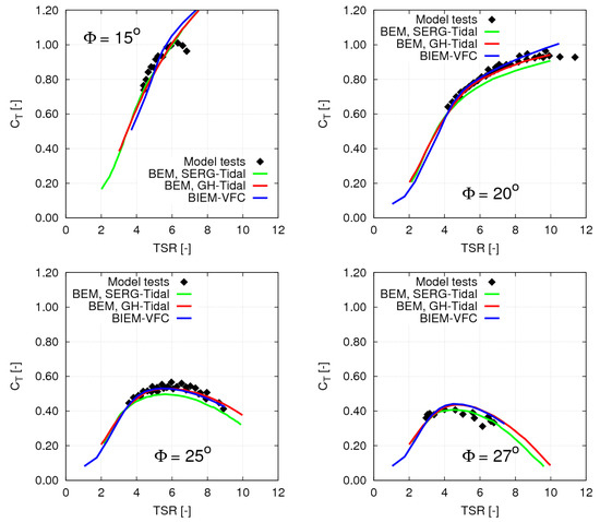 UoS-VP turbine performance predictions by BIEM-VFC compared to results of BEM models from [25]: thrust coefficient . Pitch settings to 27°.