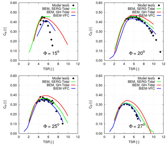 UoS-VP turbine performance predictions by BIEM-VFC compared to results of BEM models from [25]: power coefficient . Pitch settings to 27.