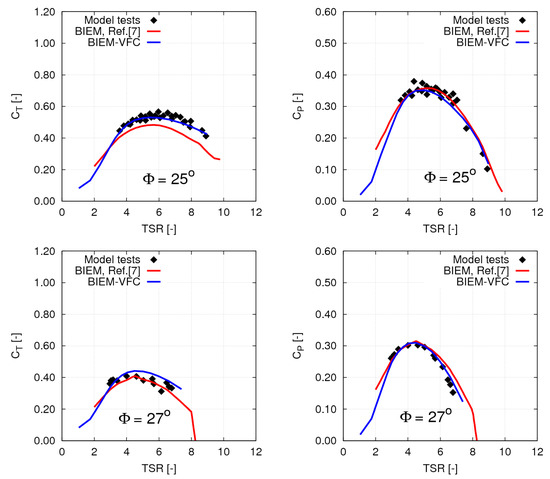 Figure 27 allows to compare BIEM-VFC results based on X-Foil predictions of sectional lift and drag properties with those obtained by considering measured lift and drag in [24]. As already commented in Figure 22, measured drag is much higher than X-Foil predictions over a significant range of angle of attack. As expected, this results in underestimation of turbine power coefficient, bottom left Figure 27. Smaller differences between measured and X-Foil lift observed in left Figure 22, have a negligible effect on predicted turbine thrust coefficient, as shown in top Figure 27.