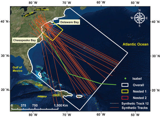 Location map for the extent of three model domains. Hourly location of hurricane Isabel shown in green solid circles. Orange lines present synthetic hurricane tracks.