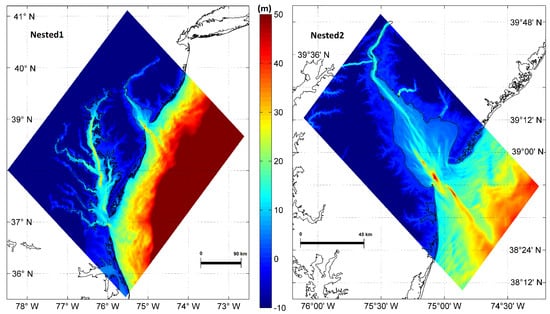 The above findings and preliminary sensitivity analysis resulted in one Overall and two Nested domains (see Figure 2) in this study. All domains are set up in a 2D fashion. RGFGRID tool of Delft3D is used to generate the curvilinear grid. Primary grid properties including curvature, smoothness, length of edge, and orthogonality are used to increase grid quality. Figure 3 and Figure 4, respectively, show the bathymetry of the Overall and Nested domains. Coastline and bathymetry are from the ADvanced CIRCulation (ADCIRC) Federal Emergency Management Agency (FEMA) Region III model []. The bathymetry is developed by the Coastal Process Branch of the Flood and Storm Protection Division, U.S. Army Engineering Research and Development Center (ERDC) using best available data. The QUICKIN tool of Delft3D combined with ArcGIS from Esri are used to assign bathymetry data to model grids. In addition, high-resolution Light Detection and Ranging (LiDAR) data were used to complement the topography near the study area.