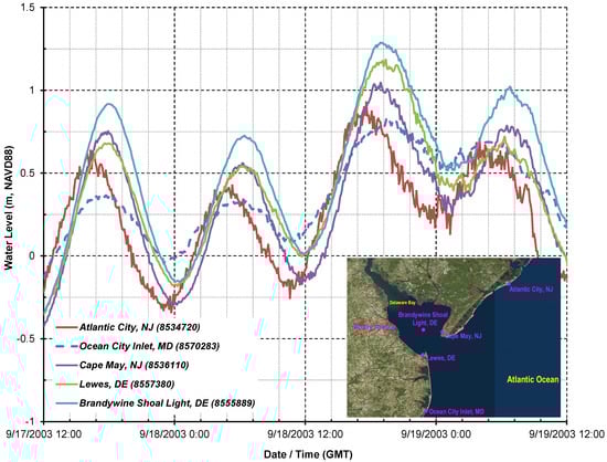 As shown in Figure 2, the Overall, Nested1, and Nested2 domains each contain three open boundaries: the south, west, and east. All open boundaries are far from the study area and calibration locations to cancel out negative impact of open boundaries. Tidal heights are imposed along all open boundaries of the Overall domain by specifying amplitude and phases. The Nested domains take their boundaries from their associated nested grid. In this region, the lunar semi-diurnal (M2) is the dominant tidal constituent []. Other constituents considered in the tidal boundary are K1, K2, Q1, S2, O1, M6, N2 and M4. Delaware Bay is classified as semi-diurnal, mesotidal, with tides ranging between 2 m and 4 m. The following is used in Delft3D to combine all of the constituents and develop the variable water level: