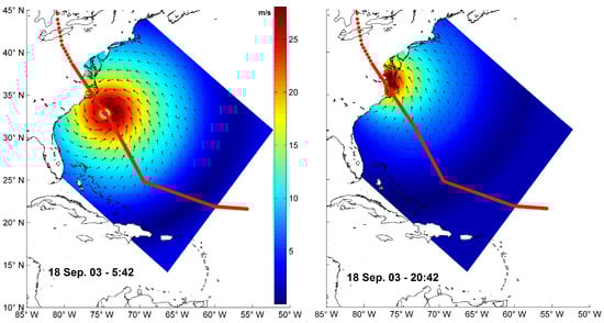 The combination of National Hurricane Center (NHC), also known as HURDAT [], and extended best-track datasets [] were used for establishing the model inputs. Data analysis showed that Hurricane Isabel can be divided into seven segments with similar characteristics (see Table 1). The hourly position of the hurricane, along with their characteristics, was then interpolated from these seven segments. The Hurricane Isabel track with hourly position of the eye is presented in Figure 1. Velocities shown in Table 1 are the 1-min maximum sustained surface winds.