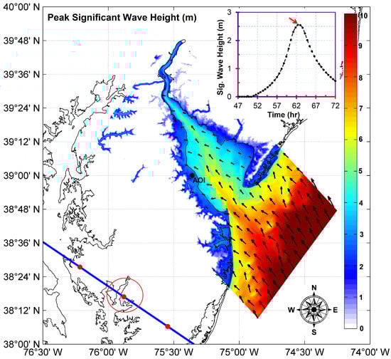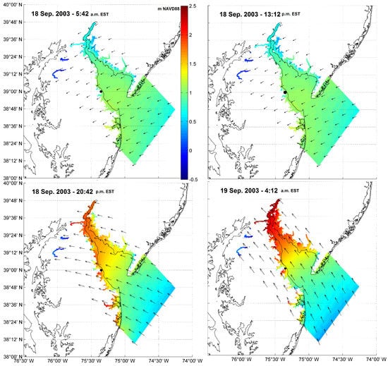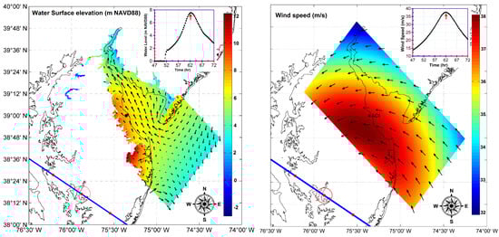 Cho et al. [] studied the response of Chesapeake Bay to Hurricanes Floyd (1999) and Isabel (2003). They found two distinct stages, the initial by remote winds and the primary with local winds, for the interaction of hurricanes and salinity intrusion. Lin et al. [] examined multiple hazards posed to the Chesapeake Bay by Hurricane Isabel (2003). Weather Research and Forecasting (WRF) and ADCIRC models are coupled to simulate storm surge. They stated that the simulation underestimated the wind speeds in the right quadrant of the storm. This is due to the simulated wind maxima being centered along the track. They reported good representation of the storm surge at the lower Chesapeake Bay compared with that at the upper portion.