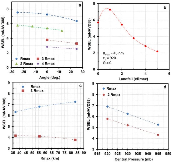 For storms making landfall west of the AOI at a distance equal to , a positive logarithmic relation was found between increasing the distance and the maximum surge at the site. Li et al. and Irish et al. [,] also reported that the maximum storm surge increases with increasing hurricane .