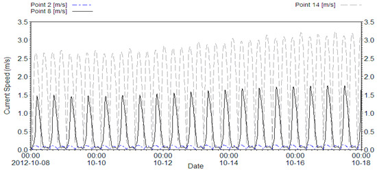 Current speed (m/s) at points 2 and 8 within the basin and 14 in the channel from the idealised model (see Figure 1 for positions of points).