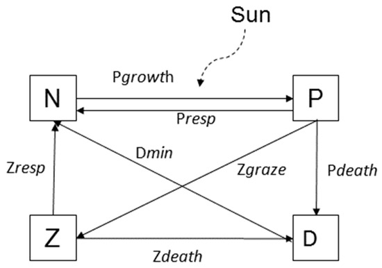 where N is the growth limiting nutrient nitrogen consisting of pooled concentrations of NO3 and NH4, P represents phytoplankton, Z zooplankton, and D detritus. A schematic model is shown in Figure 3, showing the movement of nutrients from the nutrient pool through the different stages.
