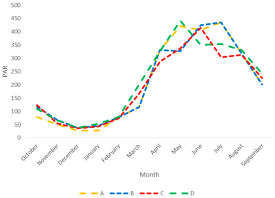The NPZD model was coupled to each of the two hydrodynamic models: with and without an array of TEDs. For photoautotrophic growth four PAR scenarios (A–D) based on PAR surface measurements made between 2004 and 2014 at the Queen’s University Marine Laboratory in Portaferry, Northern Ireland, were conducted for each of the coupled models. No full year of PAR measurements was available, so available data were collated to form four full years to provide annual variation. The resulting PAR records were representative of the strong natural annual variability in light conditions in North West Europe (Figure 4). The models were run over a one-year period from October 1 to September 30. Prior to examination of the PAR scenarios, a four-year spin-up was run using randomly selected solar radiation scenarios to assure a stable running of the system. The NPZD model was driven by initial concentrations of 5, 0.001, 0.001, and 5 of nitrogen, phytoplankton, zooplankton, and detritus without dimensions, respectively, following Fennel and Neumann [36]. In total, eight scenarios were conducted each TED setup—with and without arrays—was run for each PAR (A–D) scenario.