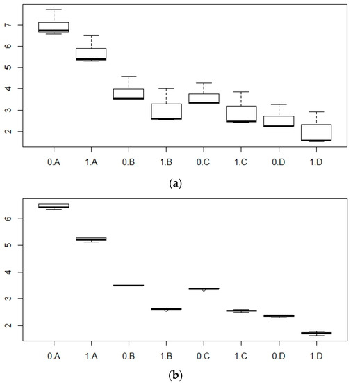 Boxplots for the mean concentrations of phytoplankton in the basin (a); in the channel (b). A–D refer to the PAR scenarios (as in Figure 4) and 0 and 1 to the scenarios without (0) and with (1) an array of TEDs. 0. A hence refers to PAR scenario A without turbines.
