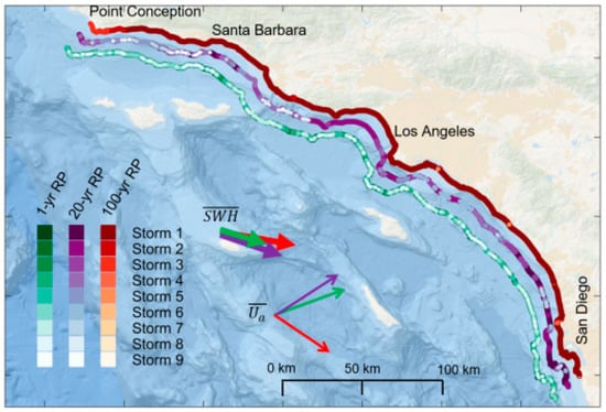 - Erikson, L.H.; Barnard, P.L.; Finzi-Hart, J.; Hayden, M.; Jones, J.; Wood, N.; Fitzgibbon, M.; Foxgrover, A.C.; Limber, P.; Vitousek, S.; et al. Projected 21st century coastal flooding in the Southern California Bight. Part 2: Extreme events and variations in coastal response. J. Mar. Sci. Eng. under review.