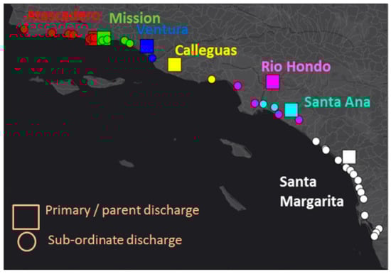 Locations and delineation of primary and sub-ordinate rivers and tributaries modeled in Southern California CoSMoS. Area-normalized runoff rates of primary (squares) discharge points were used to estimate discharge rates at sub-ordinate (circles of corresponding color) point locations.