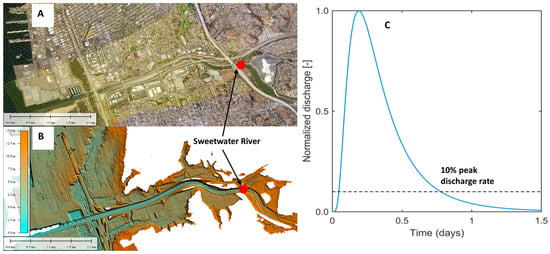 Illustration of discharge inclusion in Tier II hydrodynamic models: (A) high resolution model grid in San Diego, CA with discharge location shown as red dot; (B) elevation of same location with gauge location shown as red dot; and (C) normalized hydrograph used in discharge time-series included in each hydrodynamic simulation. Hydrograph was scaled by a river’s estimated peak discharge, Q21.