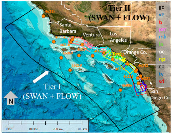 Map showing Tier I (black) and Tier II (colored) model grid extents. Wave observation buoys used in model validation (Section 3 and Appendix B) are shown with orange circles.