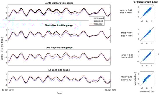 Downscaled wind and SLP fields used in this version of CoSMoS were produced and obtained from Scripps Institution of Oceanography [14,45,55]. For model validation and hindcast runs, data from California Reanalysis Downscaling at 10 km (CaRD10) was used; CaRD10 is a reconstruction of the high-spatial resolution/high-temporal scale analysis of atmosphere and land covering the state of California for global change studies [55]. For future periods, data fields from Localized Constructed Analogs (LOCA, 2011–2100 at 2.5° × 1.5°, 3-hourly resolution, derived from GFDL-ESM2M RCP 4.5) was used. Unique to LOCA’s approach, a multiscale matching scheme [45] is used to select appropriate analogs from historical libraries, constructed from CaRD10 datasets.