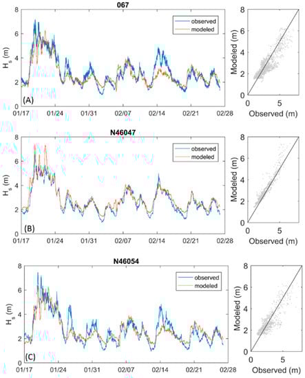 Deep water wave parameters (Hs, Tp, and Dp), obtained with the WWIII model for the CDIP067 buoy and each identified storm event (Section 2.2.3.1), were applied along all open boundaries of the Tier I SWAN grid. Wave direction is critical to accurate simulations of wave propagation from deep-water to the nearshore in the complex SCB region [22]. However, as alongshore variations in deep-water wave forcing available with the WWIII model outputs were small, particularly with respect to incident wave directions, non-varying wave boundary forcing is applied to the Tier I model.