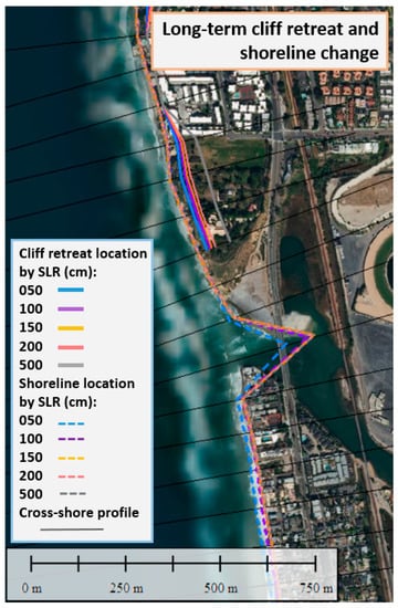 The cliff-retreat model results in time-averaged cliff edge positions and rates for each SLR scenario, at all applicable SCB transects. Projections include two management scenarios considering the existence or non-existence of hard structures that limit cliff erosion. Considered structures and armoring locations were obtained from the California Coastal Commission [72] and aerial photographs from the California Coastal Records Project [73].