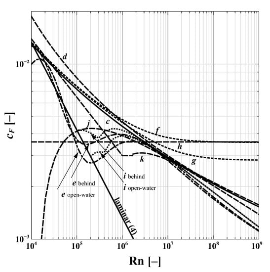 The frictional resistance of the laminar flow follows a simple correlation to the Reynolds number. However, open-water tests of propellers are conducted around Reynolds numbers of and , thus putting them into the transition region. Real size propellers work well above a Reynolds number of , generally around 5 ×, subjecting them to fully turbulent flow.