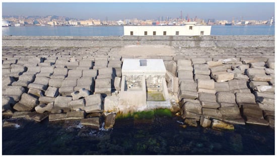 The Overtopping Breakwater for Energy Conversion (OBREC) is a highly-developed overtopping wave energy converter (OTD) totally integrated into an existing rubble mound breakwater. Its first prototype was installed in the Naples harbour at the end of 2015 with the aim of moving from the traditional approach of a dissipative coastal defence to a new, “green” structure that captures the incoming waves (Figure 2). The device collects the overtopping water above the sea level by means of a robust concrete reservoir. Then, the flow is driven towards low head turbines to generate a more useful form of energy, i.e., electricity. All the electro-mechanical devices, installed behind the OBREC crown wall, are safe from the direct action of waves, increasing the reliability of the system (Figure 3). Thanks to site-specific turbine strategy, including several pico turbines (<5 kW) or a combination of pico and micro turbines (<100 kW), OBREC works with a wide spectrum of different incident wave conditions and water levels. The device tends to be most effective in mild and poor wave climates [23,24,25,26].