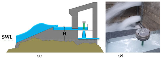 (a) OBREC’s working principle, with an overtopping ramp, reservoir and pico-turbine inside the machine room; (b) a pico-turbine installed in the engine room, and a water jet derived by the flow rate in front of the crown wall.
