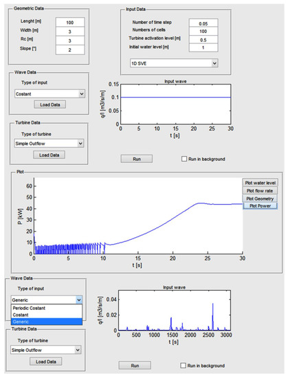 Traditionally, the energy production of a WEC is estimated by the power matrix, i.e., crossing the incident wave conditions with the expected power. Since the monitoring of the OBREC has just begun, no definitive power matrix is available. Hence, the power efficiency parameters are computed by means of a specifically-designed numerical model, called OBRECsim (Figure 4). The software provides detailed modelling of the OBREC hydrodynamics because a well-specified overtopping flow rate formula provided by an OBREC small-scale laboratory test [35], has been implemented. Moreover, the preliminary results obtained during a two-year monitoring campaign of the full-scale OBREC prototype were used to calibrate the code. These results refer especially to hydro-eletromechanical equipment efficiency, turbine strategies (i.e., start/stop strategies and turbine coupling) and power take-off efficiency.