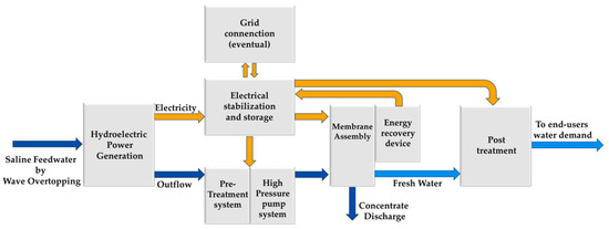 Figure 5 describes the overall scheme of the seawater RO plant specifically modified for the OBREC application. In this configuration, in fact, wave overtopping provides the saline feedwater and the main source of electricity. The major stages considered in the scheme are summarised in the following.