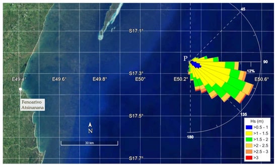 where ρ and g are respectively the sea water density and the gravity acceleration, is the wave height computed on the zero-order moment of spectral function, and Te is the wave energy period [28]. Since the ECMWF provides values for Tm, the energy period was assumed as 1.14 Tm [23,24,29,30]. For the area related to Fenoarivo Atsinanana, the chosen point from the ECMWF grid has the coordinates −17.25° S and 50.25° E, which are better described in the following sections.