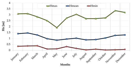 The wave climate parameters and the assessment of the monthly and yearly mean wave power based on the 20-year average are shown in Table 2. The annual wave power was found to be 12.86 kW/m. The results are graphically represented with polar diagrams assembled in Figure 6. This value is not high, as expected. In fact, despite the very long fetch along the wave sector, the region of the central Indian ocean is poor of strong storms conditions [29,45,46]. However, an important characteristic of such a wave climate is a relative low monthly, seasonal and interannual variability. This is due to the South Equatorial Current, which impinges on the coast of Madagascar as a single broad current at about 15° S. The highest seasonal variation is smoothed due to the presence of the blocking effect of the Seychelles–Mauritius Ridge (at latitude 60° E) on the annual Rossby wave [47,48] generated by the wind stress curl in the east [49]. In fact, a relatively small standard deviation of significant wave height, mean period and wave power are found (Table 2). In particular the mean percentage of power provided by Spring, Summer, Autumn and Winter are 19%, 19%, 25% and 37% respectively. The 20-year average monthly distributions of the minimum, mean and maximum significant wave height are shown in Figure 7.