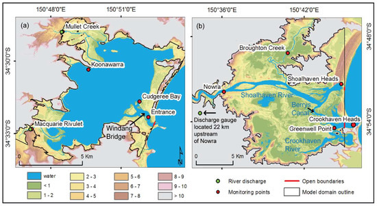 Modelling at Lake Illawarra used a spatial resolution of 15 m, an open boundary at the entrance gauge and two river discharge locations at the tributaries Macquarie Rivulet and Mullet Creek. The modelling setup for tidal simulations at the Shoalhaven Estuary used one open boundary at Crookhaven Heads that was forced with data from the respective tidal gauge. Simulations of storm surge and compound flooding used an additional open boundary at Shoalhaven Heads, because the intermittent entrance opened in response to the simulated storm event in June 2016. All simulations at the Shoalhaven Estuary used a spatial resolution of 25 m. Spatially varying bottom friction with respect to different land use types was defined using Manning’s friction coefficients taken from literature [37,38,39]. Adaptation measures such as tidal gates were only considered by their representation within the digital elevation data. Bathymetry and topography were assumed to be constant in time.