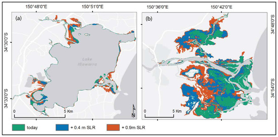 Maximum inundation extents of spring-tidal simulations for present conditions and SLR scenarios at Lake Illawarra (a) and the Shoalhaven Estuary (b).