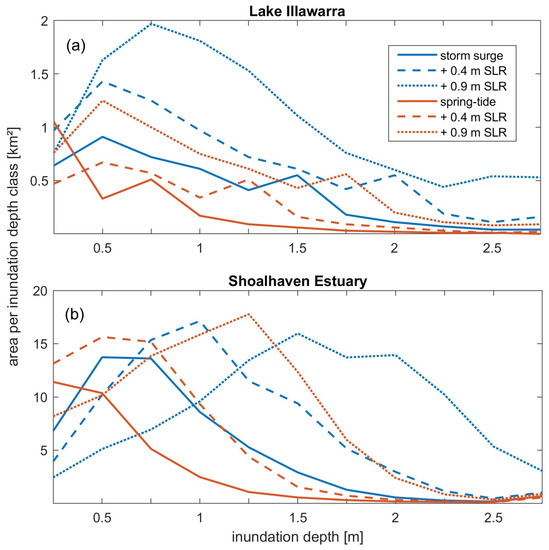 Distribution of maximum inundation depths in 0.25 m intervals across the floodplain of Lake Illawarra (a) and the Shoalhaven Estuary (b) for simulations of spring-tide (red) and storm surge (blue) in combination with present sea level as well as SLR of +0.4 m and +0.9 m. Note the difference in vertical scale due to the different size of the floodplains.