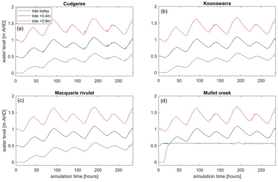 Simulated water levels for spring-tidal conditions and SLR scenarios over 6 tidal cycles at Cudgeree (a), Koonawarra (b), Macquarie Rivulet (c), and Mullet Creek (d) in Lake Illawarra. Mullet Creek monitoring point is not subject to tides at present sea level conditions due to its upstream location behind a tidal weir.